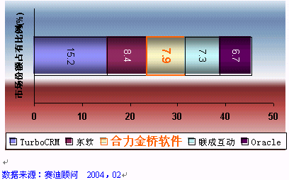 2004年2月10日,北京。賽迪顧問(CCID Consulting )在中國大飯店隆重舉辦了"2004IT市場年會", 會上發(fā)布了《2003-2004年中國管理軟件產(chǎn)業(yè)投資機(jī)會研究年度報(bào)告》。HOLLYCRM(合力金橋軟件)公司在強(qiáng)手如林的評選中憑借其強(qiáng)勁的市場占有份額、深厚的品牌實(shí)力及出眾的用戶美譽(yù)度無可爭議地穩(wěn)居2003年度中國CRM軟件整體市場份額前三甲, 同時更奪得了2003年度中國電信行業(yè)CRM市場份額龍頭位置。