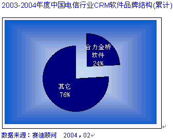 HOLLYCRM(合力金橋軟件)公司作為實(shí)力卓越的CRM主流廠商, 致力于提供最專業(yè)化的應(yīng)用軟件和服務(wù),提供以客戶為核心的信息化解決方案,服務(wù)領(lǐng)域跨越電信運(yùn)營商、金融業(yè)、制造業(yè)等行業(yè)。在電信行業(yè)的CRM市場中,合力金橋軟件處于穩(wěn)固領(lǐng)先位置, 其推出的客戶關(guān)系管理解決方案,覆蓋協(xié)作型、運(yùn)營型和分析型的全部范疇。在CRM產(chǎn)業(yè)在2003年的中國發(fā)展態(tài)勢整體放緩的大環(huán)境下, HOLLYCRM卻一枝獨(dú)秀, 在不到一年的時間里簽下中國網(wǎng)通總部、天津網(wǎng)通、山西網(wǎng)通、內(nèi)蒙聯(lián)通等大型CRM項(xiàng)目,積累了豐富的CRM項(xiàng)目實(shí)施經(jīng)驗(yàn)。在累計(jì)的電信行業(yè)CRM軟件市場中,合力金橋軟件一家占有份額就達(dá)到24%, 合力金橋軟件此次在CCID年度研究報(bào)告中倍受矚目可謂眾望所歸, 充分說明了其CRM產(chǎn)品在高端行業(yè)的領(lǐng)軍地位, 如圖: