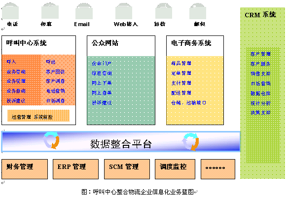 為解決傳統(tǒng)物流企業(yè)"成本高"、"效率低"的瓶頸問題,物流行業(yè)信息化目前已經(jīng)超越了關(guān)注和觀望,第一層次的信息化平臺在很多企業(yè)已經(jīng)實(shí)施,如內(nèi)部的財(cái)務(wù)管理、倉儲管理、定單管理、運(yùn)輸管理等,相關(guān)系統(tǒng)包括ERP、物流管理(LM)、SCM等應(yīng)用系統(tǒng)。更進(jìn)一步,針對物流企業(yè)核心是提供"服務(wù)"這個概念,呼叫中心、電子商物、以及CRM技術(shù)的結(jié)合將對物流基礎(chǔ)信息平臺起到至關(guān)重要的整合作用: