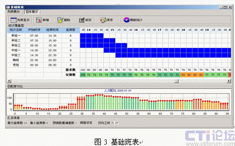 引入呼叫中心排班系統(tǒng)是提升坐席資源利用率的有效解決方案,排班系統(tǒng)可以對(duì)大量的歷史呼叫數(shù)據(jù)進(jìn)行分析,并剔除特殊事件對(duì)呼叫量的影響,從而得出呼叫量變化的規(guī)律曲線,再輔助對(duì)特殊預(yù)期事件影響度的疊加,可以對(duì)未來(lái)一定時(shí)間的呼叫量變化做出比較客觀的預(yù)測(cè)(圖2)。在預(yù)測(cè)話務(wù)量變化曲線的同時(shí),結(jié)合人員技能和班次設(shè)定,給出高擬合度的人工排班方案(圖3)。更為重要的是,成熟排班系統(tǒng)提供的話務(wù)預(yù)測(cè)模型多具備學(xué)習(xí)能力,能夠?qū)㈩A(yù)測(cè)的話務(wù)數(shù)據(jù)與實(shí)際話務(wù)數(shù)據(jù)進(jìn)行對(duì)比,從而不斷提高話務(wù)預(yù)測(cè)模型的預(yù)測(cè)精度。成熟排班工具可以在保持呼叫中心同等服務(wù)水平的前提下,降低人工坐席代表的投入數(shù)量,進(jìn)而釋放部分人工資源開展其它業(yè)務(wù)。