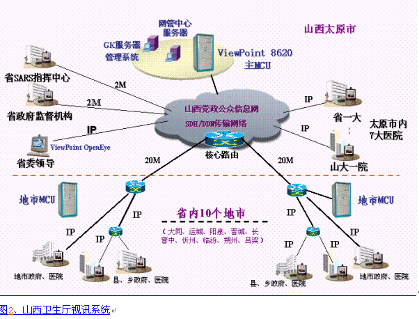 8000綜合視訊系統(tǒng),主會場設(shè)在非典防治指揮中心,利用現(xiàn)有的山西黨政公眾信息網(wǎng)絡(luò)及通信部門緊急支援的2Mbps數(shù)據(jù)專線,整個系統(tǒng)采用H.323協(xié)議,在省內(nèi)7大醫(yī)院、及省政府有關(guān)部門使用ViewPoint