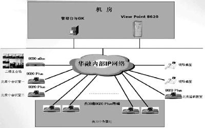 在公司總部安裝一套寬帶視訊交換平臺ViewPoint 8620及管理系統(tǒng),在公司總部建設一個大型視訊會議室作為主會場,視訊終端采用ViewPoint 8030mBox。北京另外兩個小會議室配置普通視訊終端ViewPoint 8020plus,外地30個辦事處會議室各配置一臺ViewPoint 8020plus視訊終端。2套ViewPoint OpenEye視訊終端安裝于領導桌面,可以用于接入會議、召集會議,或者內(nèi)部IP話等。本系統(tǒng)總共包括一臺ViewPoint8620視訊交換平臺,一臺ViewPoint 8030mBox視訊終端和32臺ViewPoint 8020plus視訊終端,兩套領導用桌面終端ViewPointOpenEye。