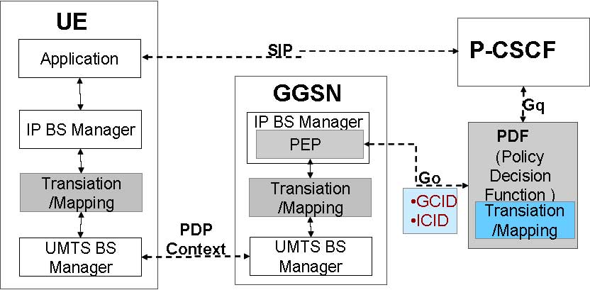 (3)PDF對(duì)IP流進(jìn)行記錄(包括流標(biāo)識(shí)符(GCID)、數(shù)據(jù)速率、QoS類別等)并授權(quán)。通過SDP參數(shù)映射到所授權(quán)的IPQoS參數(shù)而實(shí)現(xiàn),并通過GO接口(COPS協(xié)議)傳送到GGSN。