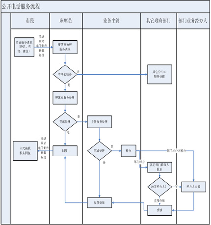 后臺(tái)處理座席員根據(jù)業(yè)務(wù)知識(shí)、資料庫和管理職責(zé)為市民服務(wù),如果不能處理,將請(qǐng)求提交相關(guān)政府部門并限時(shí)處理;