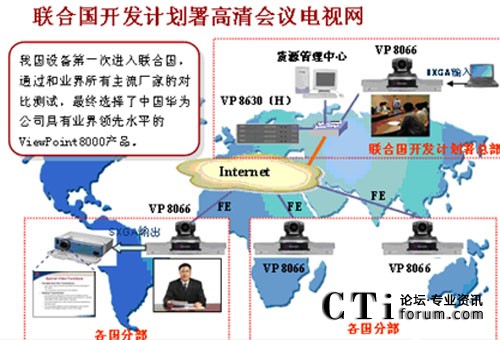 聯(lián)合國開發(fā)計劃署采用了華為ViewPoint® 8000綜合視訊系統(tǒng),視頻會議采用業(yè)界最新的H.264視頻編碼技術,節(jié)省了線路帶寬資源,同時獲得了清晰、流暢的圖像;該視訊會議系統(tǒng)同時融合了IP語音系統(tǒng),擴展了視頻會議覆蓋的范圍,實現(xiàn)了視頻會議、電話會議和電視電話混合會議;視訊會議系統(tǒng)建成后,以清晰的聲音、圖像和通過H.239雙流實現(xiàn)的PC桌面真實還原,實現(xiàn)了聯(lián)合國開發(fā)計劃署遠程會議、協(xié)同審批文件等。