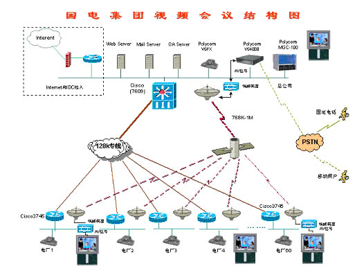 128,集團(tuán)下屬60個電廠均采用視頻終端ViewStation 128。整個網(wǎng)絡(luò)采用Polycom MCU的混速功能,在本部中心采用768Kbps進(jìn)行視頻傳輸,和下屬60個電廠及分公司采用128Kbps進(jìn)行傳輸。由于網(wǎng)絡(luò)傳輸線路分為衛(wèi)星線路和地面有線網(wǎng)絡(luò),衛(wèi)星線路帶寬為768Kbps-1Mbps,用于業(yè)務(wù)下行線路,地面有線網(wǎng)絡(luò)128Kbps用于視頻回傳。根據(jù)網(wǎng)絡(luò)傳輸線路的實際情況,在本部中心利用1臺視頻終端將其模擬信號(AV信號)送到衛(wèi)星端接設(shè)備(包含MODEM,編解碼器等),將模擬信號轉(zhuǎn)換成數(shù)字信號(MPEG4),利用768K-1Mbps衛(wèi)星線路廣播到每個接收點(diǎn),通過每個接收點(diǎn)的編解碼器將數(shù)字信號轉(zhuǎn)換成模擬信號連接到顯示終端(如TV、顯示器)上進(jìn)行收看,通過這種方式可以實現(xiàn)利用衛(wèi)星線路的高帶寬,并利用其廣播特性,節(jié)省投資。