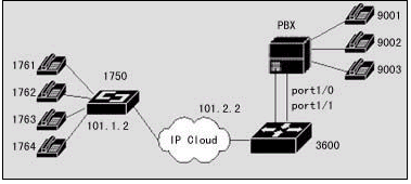 在該案例中,分部辦公室放置IP地址為10.1.1.2的DCR 1750路由器(插有二塊兩端口的FXS語音卡),總部辦公室放置IP地址為10.1.2.2的DCR 3660路由器(插有一塊兩端口的FXO語音卡),通過正確的規(guī)劃和配置可以實(shí)現(xiàn)銷售部辦公室和總部辦公室之間的IP語音連接。DCR 3660路由器是到達(dá)總部辦公室的主網(wǎng)點(diǎn),它需要連接到公司的PBX上,當(dāng)然,在分布也可以直接使用FXO語音卡和PBX直接連接,這樣在分部與總部之間可以通過IP網(wǎng)絡(luò)來撥打0話費(fèi)的長途電話。
