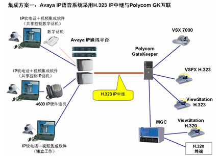 方式一:Polycom GK采用H.323 IP 中繼與AvayaIP語音系統(tǒng)集成。