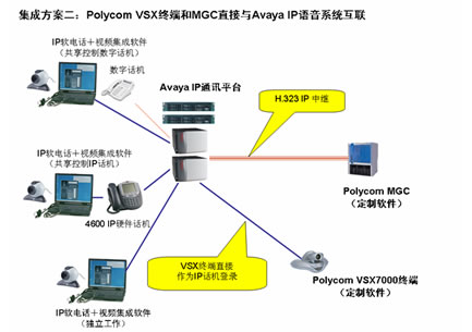 方式二:Polycom VSX系列終端和MGC直接和Avaya IP語音系統(tǒng)集成。