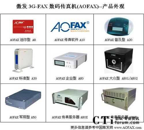 AOFAX系列電腦傳真產(chǎn)品擁有最齊全的型號,包括免費使用的AOFAX傳真軟件A10、SOHO/商旅人士便攜使用的AOFAX迷你型數(shù)碼傳真機(jī)A8、單電腦使用的AOFAX普及型數(shù)碼傳真機(jī)A20、4用戶環(huán)境的AOFAX標(biāo)準(zhǔn)型電子傳真機(jī)A30、軍警使用的AOFAX軍用型傳真系統(tǒng)A50、公安專用傳真服務(wù)器A51、營運版網(wǎng)絡(luò)傳真服務(wù)期A52、不限用戶數(shù)目的AOFAX企業(yè)型網(wǎng)絡(luò)傳真機(jī)A60、1至2線的AOFAX大眾型傳真服務(wù)器A801和A802,2至256傳真線路多種規(guī)格的AOFAX專業(yè)型傳真服務(wù)器A80X、跨區(qū)域大型公司使用的集團(tuán)傳真系統(tǒng)和行業(yè)解決方案等,價格從幾百到幾十萬元,可適應(yīng)各類型客戶的需求,以下為AOFAX全系列產(chǎn)品外觀圖。