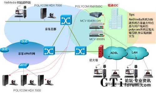 系統(tǒng)建設充分利用現(xiàn)有網(wǎng)絡資源,在業(yè)務層面上充分做到與用戶現(xiàn)有資源對接.,實現(xiàn)與原有POLYCOM H.323系統(tǒng)對接,同時在全國各區(qū)共40個倉儲系統(tǒng)建設一套高清網(wǎng)絡視頻系統(tǒng),以滿足企業(yè)內(nèi)部遠程業(yè)務應用.系統(tǒng)建成后不但可以實現(xiàn)公司高層、各大區(qū)組織成員可以通過原有H.323系統(tǒng)召開會議同時市場前沿的各區(qū)倉儲系統(tǒng)也可通過新建設的Netmedia系統(tǒng)實時能參加會議,滿足企業(yè)內(nèi)部實時、廣泛、有效、低成本溝通需要。