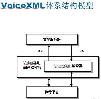 VoiceXML設(shè)計的工作原理:語音應(yīng)用程序作為系列頁存儲在類似于網(wǎng)絡(luò)服務(wù)器的文件服務(wù)器上。從實現(xiàn)平臺接收到輸入呼叫時,VoiceXML編譯程序會向文件服務(wù)器發(fā)出一個特定URL請求,就像用戶瀏覽網(wǎng)絡(luò)時輸入網(wǎng)站地址一樣。文件服務(wù)器可以與編譯程序直接相連,也可以設(shè)置在外部,通過本地網(wǎng)或互聯(lián)網(wǎng)的IP協(xié)議訪問。他們可以保持應(yīng)用程序的服務(wù)邏輯,可以提供數(shù)據(jù)庫查找與其他系統(tǒng)操作功能。