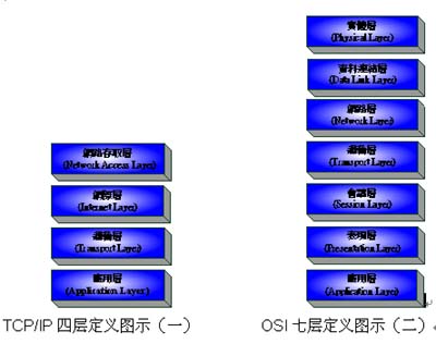 Standard Organization)所制定的標準, 下面三層偏硬件,上面三層偏軟件,中間一層偏軟件硬件間的溝通。兩種標準協(xié)議圖(一)和圖(二)來作簡單說明.