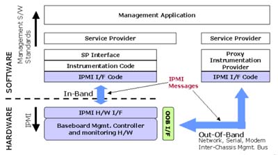 - 管理軟件:系統(tǒng)管理者最常接觸的就是上層的管理軟件,簡單的類型就是使用一般的終端機(jī)(Terminal)程序來接收從Serial/Modem所傳送過來的文字訊息。近年來,除了BMC廠商會有自行開發(fā)的上層管理軟件外,也有不少的軟件廠商加入了開發(fā)管理軟件的行列,而他們最主要利用的溝通界面即為網(wǎng)絡(luò)界面。不管是通過序列或是網(wǎng)絡(luò),在界面上傳輸?shù)亩际荁MC所能辨認(rèn)的IPMI訊息。