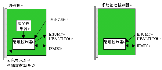 PICMG 2.9規(guī)范得到了進一步的改善,增補了一份變更通知,解決了最初2.9規(guī)范中的一些缺陷。ECR致力于定義一種就軟件來說與硬件無關的機制,這種機制能判別背板的容量以及哪個槽位已經(jīng)插入了CompactPCI單板。位于一個標準CompactPCI單板上的管理控制器可能會和地址總線、位于單板把手上熱插拔微動開關、藍色的熱插拔燈、甚至是HEALTHY和ENUM#信號聯(lián)通。典型的系統(tǒng)管理控制器板與位于外設板上的管理控制器的聯(lián)接如下圖3所示: