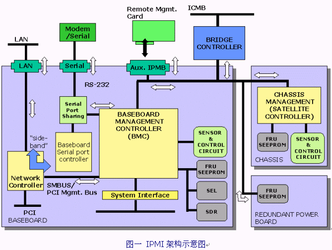 圖一為整個IPMI架構(gòu)的示意圖。位于整個架構(gòu)中心的部份即為我們所謂的Baseboard Management Controller (BMC)。它通過各別的界面來管理整個系統(tǒng),如系統(tǒng)狀態(tài)偵測及事件過濾、電源管理、記錄事件發(fā)生時間及系統(tǒng)回復(fù)控制,并且透過網(wǎng)絡(luò)或串行端口來告知管理人員,另外,它提供了IPMB的總線來和外部的管理控制器互相溝通。