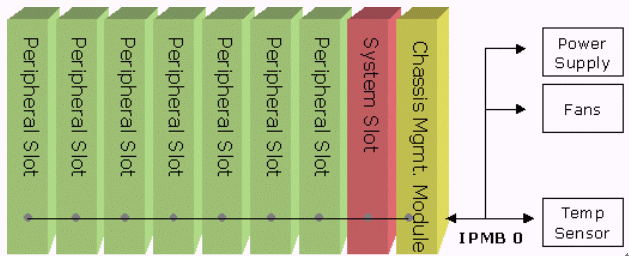 在單板上設(shè)計了支持IPMI的控制組件,對于每一片的CompactPCI單板,其系統(tǒng)上都有一個BMC的組件存在。但若整合到一個機(jī)箱內(nèi),這些BMC的角色則必須要更改成一個PMC