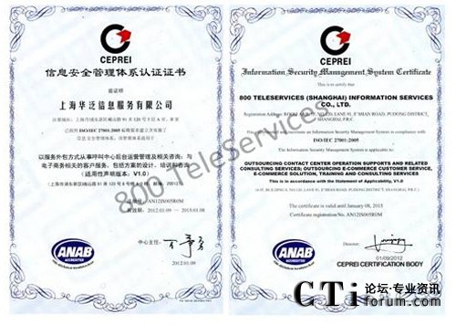 CTI論壇(ctiforum)1月31日消息(記者 浩宇):2012年1月,著名的服務外包呼叫中心和電子商務運營中心企業(yè)--飛翱集團旗下全資子公司上海華泛信息服務有限公司---,繼2009年獲得ISO9001 質(zhì)量管理體系國際認證后。經(jīng)過半年嚴格的綜合考評,再次成功獲得又一由國際上公認的ISO/IEC 27001:2005(也簡稱為:ISO27001)并獲得具有美國認證機構國家認可委員會ANAB授予的雙重信息安全管理體系認證。