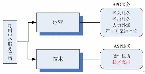 如上圖所示,運營和技術是呼叫中心最核心的兩大板塊。BPO(Business Processing Outsouring) 服務,就是我們所說的商業(yè)流程外包,對于呼叫中心市場來說,已經(jīng)發(fā)展得相對成熟,市場上各大外包呼叫中心都可以為企業(yè)提供全面的BPO外包服務,僅限于提供服務的能力和提供服務質(zhì)量不同。BPO服務幫助企業(yè)的項目管理人員節(jié)約管理時間、節(jié)約成本開銷、節(jié)約項目開銷;而ASP服務又能為企業(yè)帶來什么呢?從技術層面上講,ASP服務內(nèi)容包含了硬件和軟件兩大塊,但是人們往往忽視了ASP服務在軟件技術支持方面的應用。如果說BPO服務解放了企業(yè)的項目管理人員,那么ASP服務的技術支持則幫助企業(yè)的技術人員從繁瑣的技術支持中解放出來。