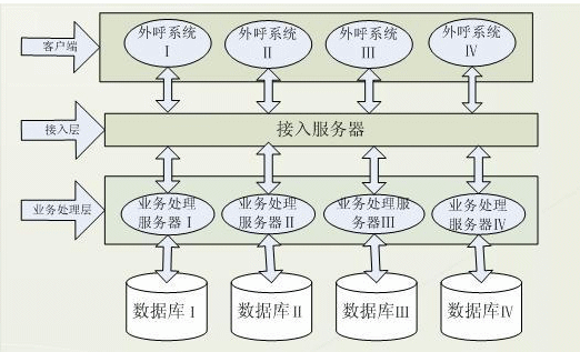 針對舊外呼業(yè)務系統(tǒng)的弊端及業(yè)務系統(tǒng)特點,賽迪呼叫研發(fā)了基于三層C/S結構的外呼業(yè)務系統(tǒng),該系統(tǒng)分客戶端,接入服務器,業(yè)務服務器及數據庫端。客戶端發(fā)送請求給分配服務器,接受到請求后,分配服務器根據客戶端的請求數據將其分配給自身的業(yè)務服務器做業(yè)務處理,這樣客戶端與業(yè)務服務器建立起聯(lián)系,結構體系如圖: