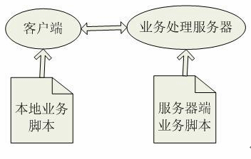 整個業(yè)務數據和業(yè)務處理都由XML配置管理,系統(tǒng)業(yè)務被分成本地業(yè)務邏輯和服務器端業(yè)務邏輯,客戶端通過提取本地業(yè)務邏輯腳本中的數據處理業(yè)務邏輯,業(yè)務處理服務器通過提取服務器端業(yè)務邏輯腳本中的數據訪問數據庫,并將數據庫返回結果發(fā)往客戶端。本地業(yè)務邏輯和服務器端業(yè)務邏輯之間的邏輯關系是通過一套配置腳本維護。如圖: