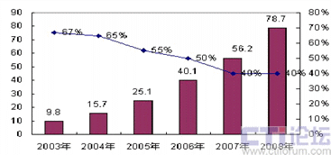 圖1-1 2004-2008年中國(guó)BSM軟件市場(chǎng)規(guī)模與增長(zhǎng)趨勢(shì)數(shù)據(jù)(數(shù)據(jù)來源:賽迪顧問)