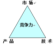企業(yè)要發(fā)展, 關(guān)鍵于企業(yè)的核心競爭力, 企業(yè)如何具有核心競爭力, 特別是通信企業(yè), 我認(rèn)為, 通信企業(yè)要具有核心競爭力, 決定于三個(gè)因素: 市場, 產(chǎn)品, 技術(shù). 這三個(gè)因素構(gòu)筑企業(yè)強(qiáng)大競爭力---競爭力三角型. 三角型的邊則是產(chǎn)品經(jīng)理的活動(dòng)軌道. 圖1-1