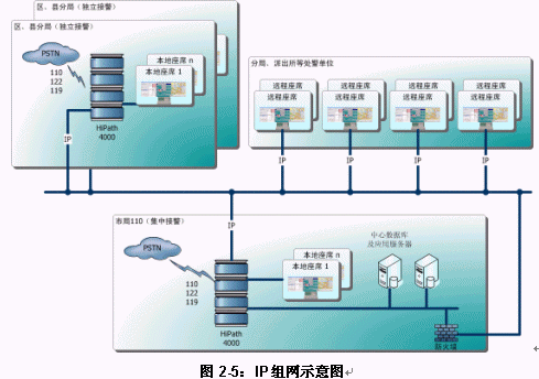 圖 2-5給出了使用純IP實(shí)施城市110組網(wǎng)的最普遍的示意。從該圖可以看出,無論采用集中接警還是分散處警,C&CC特別使用于使用純IP技術(shù)實(shí)施全市(包括所轄縣級市)110組網(wǎng)?紤]到目前全國公安二、三、四級網(wǎng)建設(shè)日漸成熟,使用純IP技術(shù)實(shí)施全市110組網(wǎng)并實(shí)現(xiàn)"三警合一"確實(shí)是經(jīng)濟(jì)、靈活而方便的選擇,前文提到的芬蘭112全國組網(wǎng)使用的也是這樣的技術(shù)。當(dāng)然,現(xiàn)存的傳統(tǒng)公安通訊專網(wǎng)仍然可以作為備份話務(wù)路由存在。