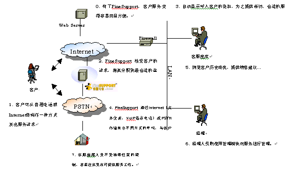 FineSupportTM網(wǎng)通呼叫中心解決方案主要由以下幾個部分組成:Media Gateway(接受來自IP網(wǎng)的網(wǎng)絡(luò)電話、傳統(tǒng)電話等呼叫,傳送給軟交換系統(tǒng))、Service Switch(軟交換系統(tǒng),負責呼叫控制)、IP IVR(存儲顧客呼叫信息,播放語音提示信息)、Soft ACD(呼叫分配服務(wù)器,可定制多種分配策略)、Web Server(負責報表管理、站點管理和監(jiān)控、FAQ存儲管理、留言及文本交談管理等)、Chat Server(建立交談通道)、Remote Agent(坐席工作站。通過客戶端軟件進行客服支持)。