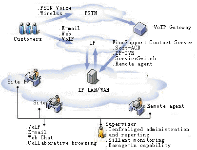 FineSupport發(fā)揮了軟交換和VoIP技術(shù)的優(yōu)勢,并融合了Internet的特性,使顧客與呼叫中心之間不僅可以通過語音進(jìn)行通信,還可以通過電子郵件、傳真、文字交談進(jìn)行通信,甚至可以實(shí)現(xiàn)在線推送網(wǎng)頁、在線網(wǎng)頁導(dǎo)航等業(yè)務(wù)。呼叫中心的客服人員只需具備一臺多媒體電腦和一副耳麥,即可向顧客提供完備的服務(wù)。
