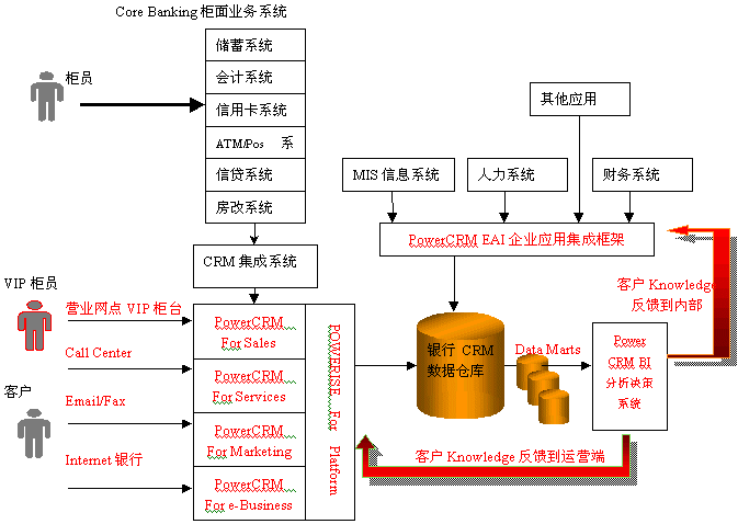 利用PowerCRM的銀行分析型CRM解決方案,對客戶信息進行全面的分析,從而挖掘出許多客戶知識,繼而制定和改進相應(yīng)的市場策略,應(yīng)用于PowerCRM運營型CRM系統(tǒng)中,更好地指導營銷人員為客戶服務(wù)和完善客戶服務(wù)流程;同時也需要反饋到銀行內(nèi)部系統(tǒng),用于增強銀行內(nèi)部的運營效率。