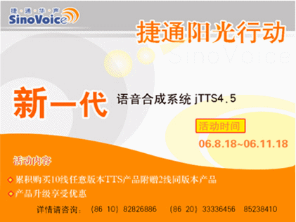 2006年8月18日,北京捷通華聲語音技術有限公司正式發(fā)布捷通華聲新一代語音合成系統(tǒng)jTTS4.5。為慶祝jTTS4.5的正式上市,同時也為回饋廣大用戶,為期三個月,推廣jTTS4.5的捷通華聲“陽光行動”同步全面啟動!
