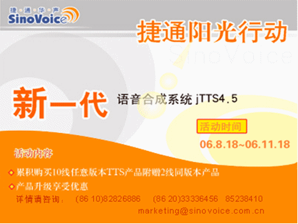 為慶祝jTTS4.5的上市,同時(shí)也為回饋廣大用戶(hù),捷通華聲進(jìn)行為期三個(gè)月的推新品“陽(yáng)光行動(dòng)”!詳情敬請(qǐng)瀏覽:http://www.sinovoice.com.cn/xwzx/20060818.htm