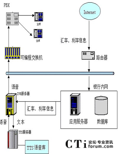 銀行可從網(wǎng)上下載匯率信息或利率信息,之后將這些信息的文本傳遞給IVR服務(wù)器,IVR會(huì)通過(guò)調(diào)用TTS服務(wù)器得到這些信息的語(yǔ)音流,之后就可以在坐席上播放這些匯率或利率的語(yǔ)音了。