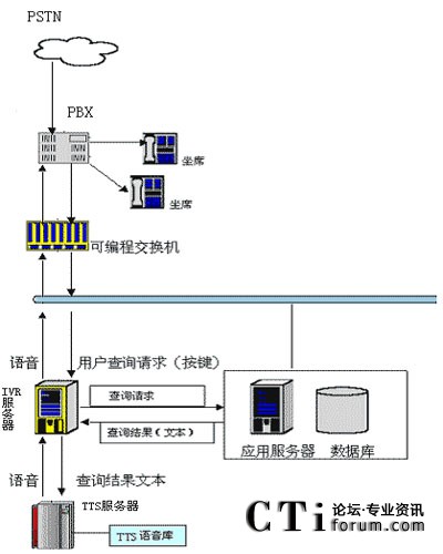 用戶(hù)可以通過(guò)電話提交他的查詢(xún)請(qǐng)求(比如使用按鍵方式,提交個(gè)人卡號(hào)等),IVR服務(wù)器收到請(qǐng)求后會(huì)向其他應(yīng)用服務(wù)器提交此查詢(xún)請(qǐng)求,當(dāng)IVR得到查詢(xún)結(jié)果后,他會(huì)將文本形式的查詢(xún)結(jié)果交給jTTS服務(wù)器,jTTS服務(wù)器會(huì)返回查詢(xún)結(jié)果的語(yǔ)音形式,最終語(yǔ)音會(huì)在坐席上播放,用戶(hù)就可以聽(tīng)到他剛才所要查詢(xún)的信息。