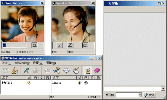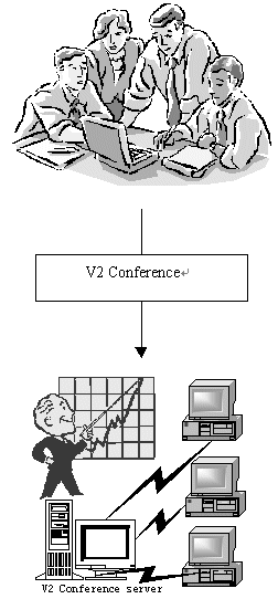 I P視頻會議,是一種利用普通的PC機(jī)加上簡單的視頻攝像頭和耳機(jī)麥克風(fēng),通過Internet或者是局域網(wǎng)進(jìn)行傳輸,以低廉的成本傳送數(shù)據(jù)、視頻和音頻信號的新型會議方式。V2公司的視頻會議產(chǎn)品V2 Conference 就采用了這種技術(shù)先進(jìn)而且經(jīng)濟(jì)合算的方式,與傳統(tǒng)的需要專用的服務(wù)器和硬件支持的視頻會議相比,該系統(tǒng)可以使您無需進(jìn)行成本高昂的投入,就實現(xiàn)高質(zhì)量、高可靠性的音視頻通訊。同時,為了方便您的管理,V2 Conference提供了會議管理的功能,使您足不出戶,就可以掌控全局。