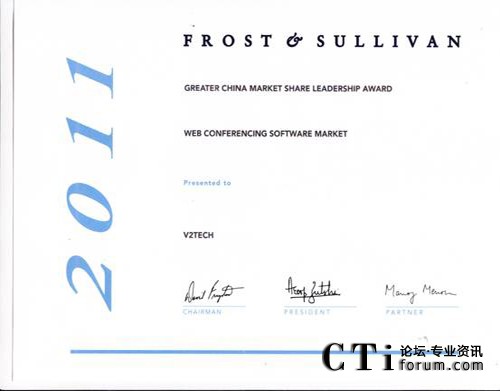 CTI論壇(ctiforum)1月12日消息(記者 浩宇):全球領(lǐng)先的Web會(huì)議解決方案供應(yīng)商V2威速宣布,榮獲全球領(lǐng)先咨詢公司Frost&Sullivan頒發(fā)的“大中華區(qū)Web軟件會(huì)議市場(chǎng)份額領(lǐng)導(dǎo)者”殊榮。Frost & Sullivan設(shè)立該獎(jiǎng)項(xiàng)旨在表彰各個(gè)行業(yè)領(lǐng)域在過去一年業(yè)績(jī)表現(xiàn)最佳并占有最高市場(chǎng)份額的企業(yè)。