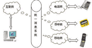 UMS可以將電子郵件、語音、尋呼、移動短消息、傳真和多媒體數(shù)據(jù)等所有信息類型集合為一個信息,并可用電話、傳真、手機、呼機、PC、掌上電腦、PDA等通信設(shè)備中的任何一種接收,在有線、無線、互聯(lián)網(wǎng)之間架構(gòu)起一個信息互聯(lián)通道(如圖)。統(tǒng)一信息系統(tǒng)(Unified