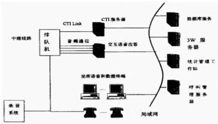 中型呼叫中心:人工座席在50~100之間的呼叫中心稱為中型呼叫中心。中型呼叫中心PBX與CTI服務(wù)器、人工座席直接相連,人工座席又與應(yīng)用服務(wù)器相連,客戶資料存儲(chǔ)在應(yīng)用服務(wù)器中,應(yīng)用服務(wù)器實(shí)時(shí)地將打入電話的客戶的資料自動(dòng)地在計(jì)算機(jī)屏幕上彈出,使座席人員能及時(shí)獲得相應(yīng)信息。CTI服務(wù)器一般由CTI硬件開(kāi)發(fā)商的板卡和PC組成。