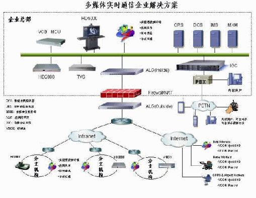 VCON提供了以HD系列的視頻終端產(chǎn)品和以VCB系列的多點控制單元(MCU)產(chǎn)品來構建基于IP網(wǎng)絡,采用H.323協(xié)議作為標準協(xié)議的視頻通信解決方案。通常主會場選擇會議室型終端HD5000,該終端在64Kbit/s下就可以實現(xiàn)畫面流暢的動態(tài)雙流;主會場也可以選擇機架式會議終端HD2000,這樣主會場可以選配正裝和吊裝攝像機,拍攝會場不同角度的場景;多點控制單元(MCU)選擇VCB3000,同時可以為領導、個人桌面或者出差用戶單獨配置支持H.323標準的Vpoint HD軟終端,該終端是目前業(yè)界惟一支持H.264、雙流、組播接受以及遠程控制的軟終端產(chǎn)品。