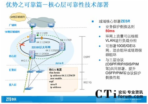 核心交換機主要是匯聚下行的全千兆智能路由交換機,所以要求設備提供高密度板卡和線速轉(zhuǎn)發(fā)的能力。同時保證對下行端口進行帶寬控制,中興采用萬兆路由交換機ZXR10 8905來滿足用戶的需求。ZXR10 8900系列萬兆路由交換機是中興通訊推出的新一代的大容量核心/匯聚路由交換機系列產(chǎn)品,主要定位于運營商IP城域網(wǎng)、校園網(wǎng)、電子政務網(wǎng)和大型企事業(yè)網(wǎng)等網(wǎng)絡的核心/匯聚層。ZXR10 8900系列萬兆路由交換機基于先進的模塊化理念進行設計,并采用了基于多處理器并行處理機制和Crossbar空分交換結(jié)構的體系結(jié)構,關鍵模塊均采用可以1:1進行冗余備份。ZXR10 8900系列具備10GE、GE、FE等各種豐富的接口模塊,并全面支持IPv4、IPv6、組播、QOS、帶寬控制等業(yè)務功能。ZXR10 8900系列整個系統(tǒng)所具備的高可靠性、高擴展性、良好的業(yè)務能力等特點,可以滿足各種網(wǎng)絡核心/匯聚層的建設需求。
