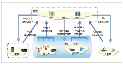 中興通訊增強端到端信息感知和開放接口,提出一套標準架構(gòu)如圖2所示,來實現(xiàn)整個網(wǎng)絡(luò)透明、可視。建設(shè)網(wǎng)絡(luò)信息采集體系,增強感知云的端到端分析能力;建立“桌面云-感知云”的云端一體化架構(gòu),提供網(wǎng)絡(luò)推送能力;感知云向終端開放網(wǎng)絡(luò)信息和能力,增強用戶感知網(wǎng)絡(luò)、定制個人體驗?zāi)芰;感知云向業(yè)務(wù)開放網(wǎng)絡(luò)信息和能力,拓展合作發(fā)展增值業(yè)務(wù)的能力。