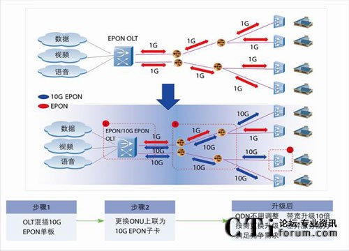 項(xiàng)目選取的試點(diǎn)小區(qū)建設(shè)于2006年,原來(lái)規(guī)劃的是每用戶(hù)6M帶寬。后期小區(qū)實(shí)裝率高,實(shí)際用戶(hù)超過(guò)1500戶(hù),IPTV業(yè)務(wù)申請(qǐng)量提升后,出現(xiàn)了高峰時(shí)段IPTV點(diǎn)播業(yè)務(wù)不流暢、同時(shí)應(yīng)用IPTV和上網(wǎng)業(yè)務(wù)時(shí)網(wǎng)速過(guò)慢等問(wèn)題。而且當(dāng)湖北電信新推出10M~20M的新寬帶套餐時(shí),該小區(qū)用戶(hù)申請(qǐng)新套餐數(shù)量受限。該小區(qū)的寬帶接入網(wǎng)絡(luò)已經(jīng)明顯無(wú)法滿(mǎn)足用戶(hù)日益增長(zhǎng)的需求,寬帶提速正當(dāng)其時(shí)。選擇10G EPON,能夠簡(jiǎn)單兩步,將小區(qū)接入方式從EPON平滑升級(jí)為10G EPON,無(wú)需改變網(wǎng)絡(luò)結(jié)構(gòu),只需簡(jiǎn)單升級(jí)設(shè)備(見(jiàn)圖)。