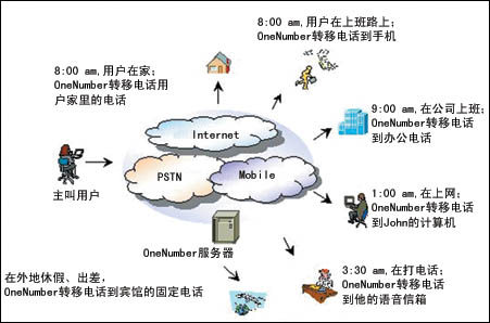 通過(guò)OneNumber這一業(yè)務(wù)系統(tǒng),電信運(yùn)營(yíng)商可以整合用戶(hù)的各種號(hào)碼資源,有效留住客戶(hù);用戶(hù)只需申請(qǐng)一個(gè)OneNumber號(hào)碼,無(wú)論用戶(hù)走到哪里,主叫用戶(hù)都可以通過(guò)電話(huà)、手機(jī)、PC等方式撥打該號(hào)碼聯(lián)系到用戶(hù)。用戶(hù)接受信息的手段可以根據(jù)自己的設(shè)定,以電話(huà)、手機(jī)、短信、PC等方式與主叫用戶(hù)建立聯(lián)系,也可以語(yǔ)音信箱的方式收聽(tīng)留言。