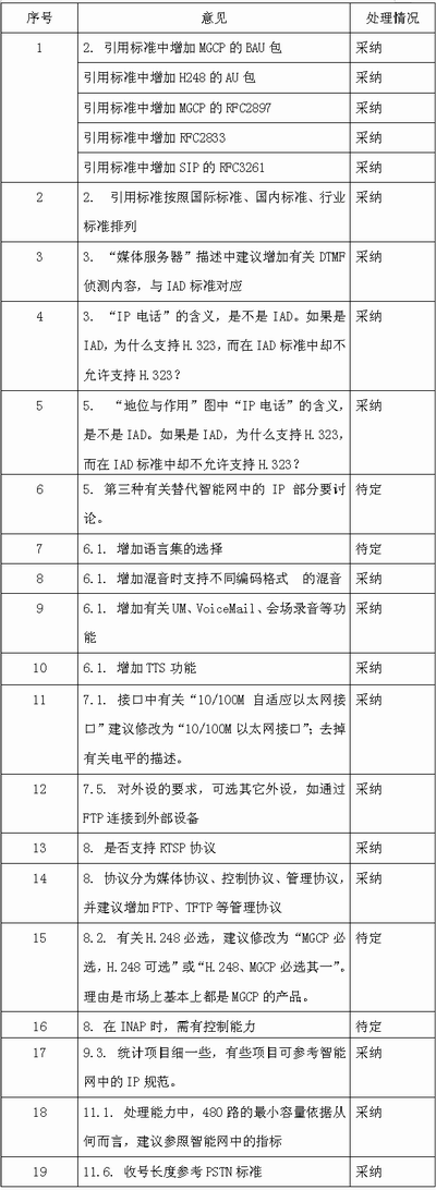 附表:8月1日~2日,網(wǎng)絡與交換標準研究組對于“基于軟交換的媒體服務器的技術要求”的征求意見選登。