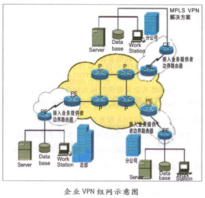 下圖是提供VPN業(yè)務(wù)的例子。其中業(yè)務(wù)提供者邊界路由器(PE)相當(dāng)于MPLS區(qū)域邊界路由器(LER),它了解整個(gè)MPLS VPN的網(wǎng)絡(luò)拓?fù)浣Y(jié)構(gòu)。用戶邊界路由器(CE)可以只是一個(gè)