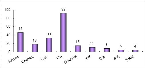 各品牌的認(rèn)知度與其市場銷售情況息息相關(guān)。例如,VTEL是最早進(jìn)入中國市場的視頻會議廠商,并在相當(dāng)長的時期內(nèi)占據(jù)市場領(lǐng)先地位,取得顯著的品牌認(rèn)知度是有其廣泛用戶基礎(chǔ)作為支撐的;POLYCOM雖然從1998年才開始進(jìn)軍中國市場,但在基于IP的視頻會議系統(tǒng)的市場爭奪中取得較好的成績;PictureTel已經(jīng)被POLYCOM收購,品牌認(rèn)知度也相對較低;而國內(nèi)品牌中興、華為剛剛起步,也很難達(dá)到較高的認(rèn)知度。