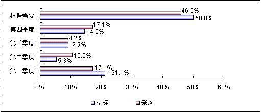 賽迪顧問針對視頻會議終端系統(tǒng)用戶招標(biāo)與采購的調(diào)查表明,用戶招標(biāo)與采購的季節(jié)性差異比較明顯,除了將近50%的用戶會根據(jù)需要在不確定的時間里進(jìn)行招標(biāo)和采購以外,第一季度和第四季度成為用戶招標(biāo)和采購相對集中的時間段,這與許多其他商用IT產(chǎn)品的采購類似。具體到招標(biāo)和采購的月份,10月份成為最為集中的時間。原因在于,視頻會議終端系統(tǒng)的采購受行業(yè)用戶的資金規(guī)劃與使用的影響顯著。第一季度往往是各企事業(yè)單位資金充裕的時期,到了第四季度又是政府部門為完成本年度信息化建設(shè)的任務(wù),往往產(chǎn)生比較集中的設(shè)備采購。