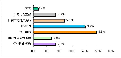 此次調(diào)查顯示,由于視頻會議系統(tǒng)的行業(yè)性相對較強,目前用戶在了解視頻終端會議系統(tǒng)產(chǎn)品時,報刊媒體、Internet、廠商推廣活動、廠商電話直郵和行業(yè)權(quán)威機構(gòu)成為主要的信息來源渠道。值得注意的是網(wǎng)絡(luò)的普及使得更多的用戶也選擇Internet作為了解信息的重要途徑。但對各視頻會議系統(tǒng)的廠商而言,由于客戶群體相對龐大,分散區(qū)域較為廣泛,在作好直銷的同時,也應(yīng)該加強渠道的建設(shè),以更及時和準(zhǔn)確地了解到用戶采購和招標(biāo)的信息,同時也能夠降低銷售成本。