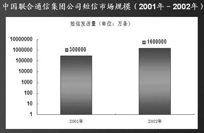 “從2001年的189億條增長到2002年的超過900億條,我國短信業(yè)務(wù)的增長率是移動(dòng)用戶數(shù)增長率的3.4倍! 計(jì)世資訊分析師許牧說。